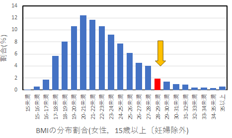 引用:政府統計 BMIの分布 – BMIの区分,人数,割合 – 総数・男性・女性,15歳以上〔妊婦除外〕