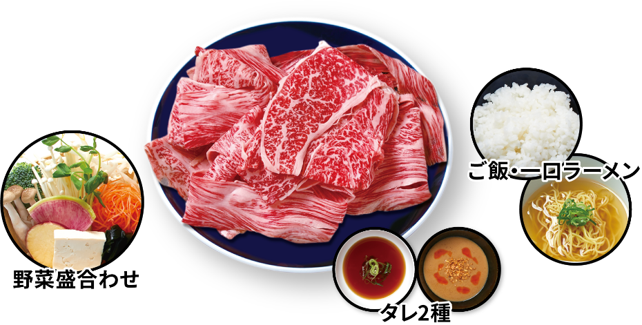 熟成黒毛和牛 切り落としセット(980円):2週間ドライエイジングしたA5・A4ランクの黒毛和牛がこの価格!ご飯おかわり自由、野菜10種盛り合わせ、〆の一口ラーメン付き
