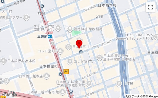 最寄り駅は東京メトロ銀座線の三越前駅で、A6出口から徒歩1~2分という好立地。半蔵門線の三越前駅A4出口からは徒歩5分、JR新日本橋駅からも徒歩6分ほどです。ショッピング施設のコレド室町2に入っているため、買い物のついでに立ち寄ることもできますね。